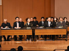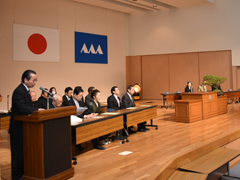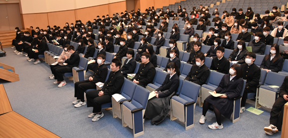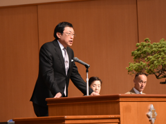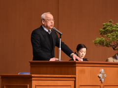 佐野隆一副会長の開会のあいさつに続き、小嶋彌左衛門会長から「卒業おめでとう。クラスが同じであれば同級生、学年が同じなら同期生、高校が同じであれば同窓生になる。同窓会は学校、在校生の支援に努めている。みなさんの協力も宜しく御願いしたい。みなさんはバラバラになるが各地に同窓会支部がある。同窓会は情報交換、旧交を温めることができる場である。ぜひ活用していただきたい。そして同窓会をより盛り上げて頂きたい。」とお祝いのあいさつがあった。そして磯部道昭常務理事から同窓会規約をもとに興譲館同窓会の説明があった。