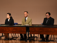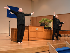 そして同窓会からのもう一つのプレゼントとして応援団OBの石井宏幸君が栄光の道をリードし、南浩史君がエールを送った。南くんの透き通った声のエールに一同感銘を受けた。 最後に藤倉万里子副会長による閉会のあいさつで入会式を終了した。