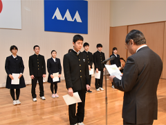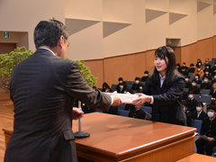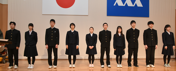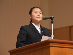 続いて、小嶋会長より高橋優奈さんに記念品(印鑑セット)が授与され、その後198名の新入会員を代表して黒田愛奈さんが、不安がいっぱいだった入学時から、多くの人に支えられ責任感、決断力を養えた三年間の思い出、そして同窓会の支援への感謝と同窓会会員としての抱負と決意を述べた。