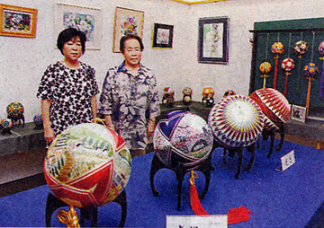 御殿まりの制作に取り組む今村愛子さん(81)=米沢市舘山4丁目=と、長女で水彩画や油絵を描く清水恵子さん(59・S49卒)=同市万世町牛森=の親子展が、南陽市赤湯の湯のまちギャラリーみはら堂で開かれている。