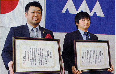 置賜地域農林水産業若者賞を受けた安達芳紀さん(H9卒・左)と遠藤寛寿さん