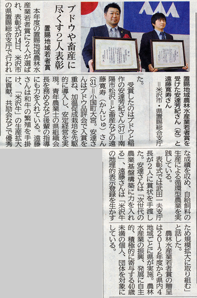 ブドウや畜産に尽くす2人表彰・置賜地区若者賞 (2017年3月15日山形新聞より)