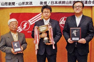 閉会式では、審判庁の石川善雄同連合会酒田支部長が太田六段に優勝杯、斎藤六段と高橋五段に記念の盾などを贈呈。「太田六段に追い付け追い越せで山形の囲碁を盛り上げてもらい、東北六県囲碁大会での優勝を期待している」と激励した。