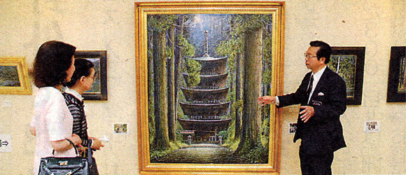 沖津さんは17年余り取り組んできた芭蕉を中心に、文学作品を踏まえて風景を描くことを続けている。現場にキャンバスを持ちこみ、点描で描く。米沢市の舟坂峠で描いた作品は、真壁の詩「峠」を意識した。過去から未来へと続く道をイメージしたという絵は、人生の岐路をうたった真壁の詩に重なる。杉並木の間に立つ羽黒山五重塔を描いた大作「緑陰の塔」、夕日が最上川を照らす「夕照最上川」など88点を展示している。