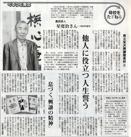 「まほろばの里」と呼ばれる高畠町で有機農業に先駆的に取り組み、詩を作り続けてきた星寛治さん(81)=1953年度卒。家業を継いだ当初は「将来が見えなかった」という。米とリンゴを生産する労働の中から農民の誇りを見いだし、地域づくりを手始めに、人間の生き方や社会のあり方を発信し続けている。