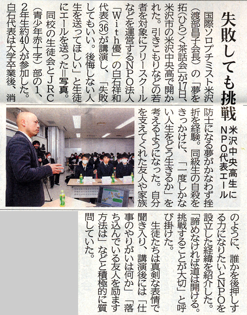 国際ソロプチミスト米沢(渡部昌子会長)の「夢を拓く(ひらく)茶話会」が17日米沢市の米沢中央高で開かれた。引きこもりなどの若者を対象にフリースクールなどを運営するNPO法人「With優」の白石祥和代表(36・H12卒)が講演し、「失敗してもいい、後悔しない人生を送ってほしい」と生徒にエールを送った。