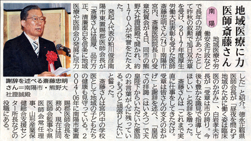 地域医療や労働安全行政などで長年の功績があったとして昨秋の叙勲で旭日双光章を受け、2017年度厚生労働大臣表彰も受けた医師斎藤忠明さん(74・S37卒)=南陽市宮内、斎藤医院院長=の受章祝賀会が4日、同市の熊野大社證誠殿で開かれ、約170人が栄誉をたたえた。