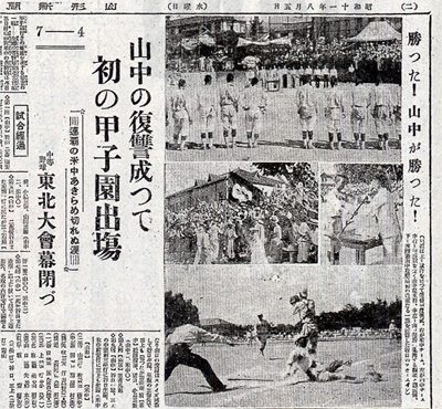 県大会決勝と同カードとなった大一番は、雪辱を誓った山形中が四回に2点を先制し、主導権を握った。5点リードで迎えた九回裏、1死満塁のピンチから直後に2点を奪われると、次打者が放った打球は外野へ飛んだ。中堅手が柵際で好捕し、7‐4で逃げ切った。翌日の紙面には「勝つた!山中が勝つた!」との見出しが躍った。本県球史に新たな歴史が刻まれた。