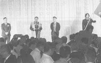 懇親会では、吹奏楽研究会OB会の演奏で(※2)、佐藤美洋副実行委員長が掲げる同窓会旗を先頭に遠藤委員長らが入場。遠藤委員長は「平成が終わりを告げ、新しい年号の時代に入ろうとしている。変らない、変えてはいけない興譲の心、向上への情熱を継いでいき、新しい扉を迎える準備をして参りましょう」などとあいさつした。