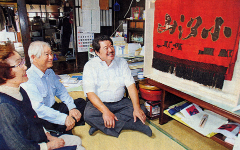 生家に戻った化粧まわしを見つめる小林幸子さん、吉村敏明さん、小形芳美さん(S49卒)