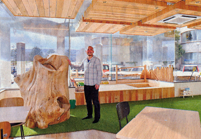 店名の由来となったハルニレの遊具の脇に立つ白石祥和代表(H12卒)