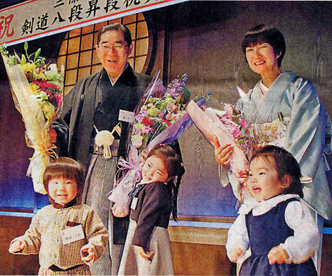 剣道の最高段位八段昇段試験に昨年11月、合格した歯科医師三條貞夫さん(66・S45卒)=米沢市城南1丁目=の祝賀会が2日、同市のグランドホクヨウで開かれ、約150人が難関突破の偉業を祝った。