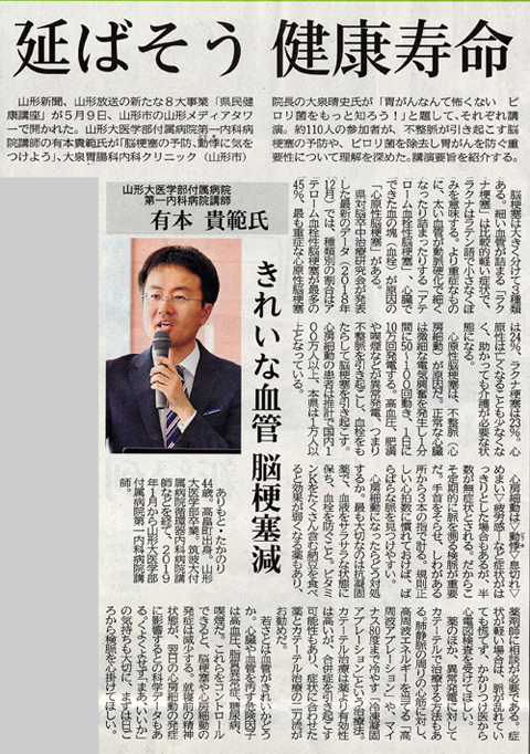 山形新聞・山形放送の新たな8大事業「県民健康講座」が5月9日、山形市の山形メディアタワーで開かれた。山形大学医学部付属病院第一内科病院講師の有本貴範氏が「脳梗塞の予防、動悸に気をつけよう」、大泉胃腸科内科クリニック(山形市)院長の大泉晴史氏が「胃がんなんて怖くない ピロリ菌をもっと知ろう!」と題して、それぞれ講演。約110人の参加者が、不整脈を引き起こす脳梗塞の予防や、ピロリ菌を除去し胃がんを防ぐ重要性について理解を深めた。講演要旨を紹介する。
