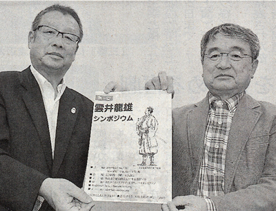 雲井龍雄シンポジウムのチラシを持つ屋代久理事長(左・S47卒)ら=米沢市役所