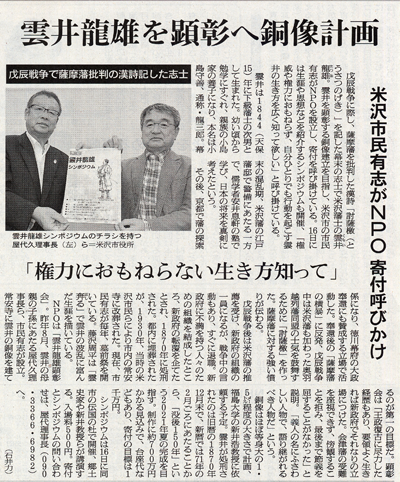 NPOは「雲井龍雄顕彰会」。昨年8月、雲井の母親の子孫にあたる屋代久理事長(S47卒)ら、市民有志が設立。常安寺に雲井の銅像を建てるのが第一の目標だ。顕彰会は「王政復古に尽力した経歴もあり、要領よく生きれば新政府でそれなりの立場につけた。会津藩の受難を座視できず、傍観することを拒み、最後まで節義を屈することがなかった」と説明。「義人の名にふさわしい人物で、語り継がれるべき人物だ」という。