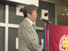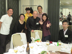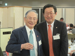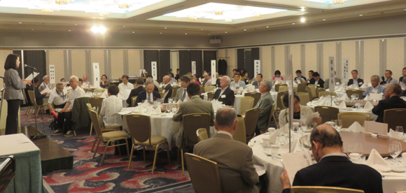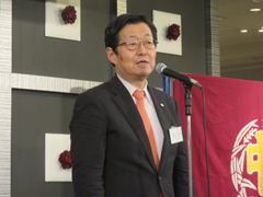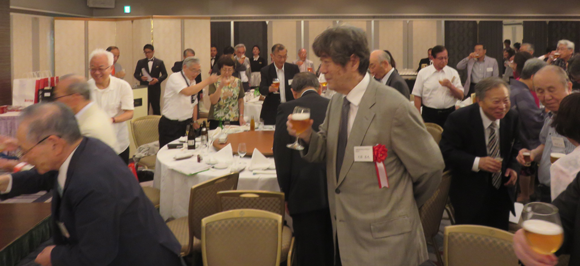 午後5時から小嶋建介副幹事長(S42年卒)が司会をつとめ懇親パーティーが始まった。在校時応援団の山口宏君(S55年卒)、五十嵐良輔君(H元年卒)のリードのもと興譲館校歌の斉唱が行われた。続いて小島長五郎体育文化後援会会長(S44年卒) 、高鍋高等学校在京同窓会久保昌也副会長が祝辞を述べられた。久保副会長は「戦前にあった両校の同窓会の交流が復活し、続いていることは大変嬉しい。今後とも宜しく」と述べられ、復活秘話を披露して頂いた。その後、米沢興譲館高等学校第34代校長五十嵐京子先生の乾杯で懇親の幕が開いた。110名を越える参加者は、バイオリンの美しい音色の余韻にひたりながら、楽しい夕べを過ごした。会の終盤には景品抽選会が行われ、故郷米沢に因む物がプレゼントされた。