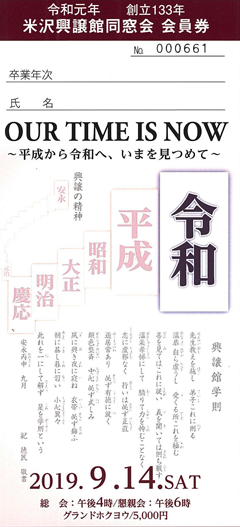 今年のテーマは、『OUR TIME IS NOW〜平成から令和へ、いまを見つめて〜』です。わが興譲館は1779年に細井平洲先生から「興譲館」と命名され、以来19もの元号を経て今に至っています。変わりゆく時代の中、私たち個々の時間は常に前へ前へ進んでいきます。平成から令和へ、何も変わらないのかもしれません。でも何かがきっと変わらなくてはいけないのだと思います。今を見つめることで未来が見えてきます。「自他の命を尊重する精神」「己を磨き誠を尽くす精神」「世のために尽くす精神」この三つの興譲の精神は時代が変わっても脈々と受け継がれています。興譲館という同じ学舎で過ごした同窓生の皆様とひとつの時間を共有できることを大変光栄に幸せに感じます。