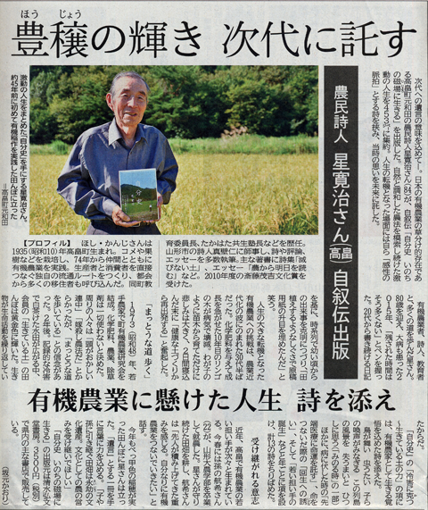 次代への遺言の意味を込めて―。日本の有機農業の草分け的存在である高畠町元和田の農民詩人星寛治さん(84・S29卒)が、自叙伝「自分史 いのちの磁場に生きる」を出版した。自然と調和した農法を模索し続けた激動の人生を453ページに集約。人生の転機となった場面には自ら「感性の脈拍」とする詩を挟み、当時の思いを未来に託した。