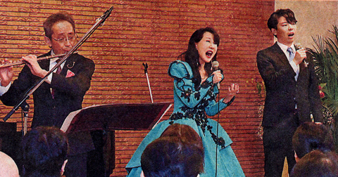 松倉さんのほか、山形交響楽団首席フルート奏者の足達祥治さん、ピアニスト小野弘子さん、バリトン松倉望さんが出演した。「ウィーン我が夢の街」で幕を開け、ミュージカル映画の楽曲やクラシック歌曲、「まっかな秋」といった童謡も披露。華やかな歌声と軽快な演奏が会場を包んだ。
