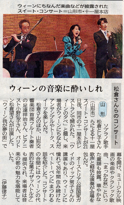 ソプラノ歌手松倉とし子さん(山形市・S48卒)らによる十一屋スイート・コンサートが21日夜、同市の十一屋本店レストランで開かれた。「ウィーンの夕べ」と題し、来場者がウィーンにちなんだアンサンブルやトーク、スイーツを楽しんだ。