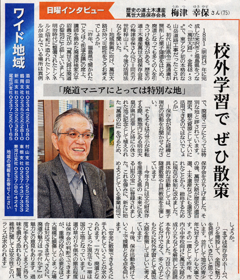 1881(明治14)年に完成した米沢市と福島県をつなぐ「萬世大路(ばんせいたいろ)」。全長48.3キロで、東アジア初の本格的な山岳道路工事だったとされる。初代山形県令三島通庸が開削した栗子隧道をはじめ、廃道となっても多くの人を引きつける魅力がある。歴史の道土木遺産萬世大路保存会長の梅津幸保さん(75・S39卒)=同市万世町梓山=に、今後の活用法などを聞いた。