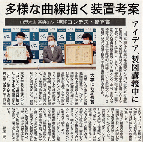 山形大工学部2年生の高橋謙太さん(19・H31卒)が考案した多機能描画装置が、文部科学省などが主催する学生対象の2019年度パテント(特許)コンテストで優秀賞に選ばれた。同学部からの受賞者は高橋さんが5人目となる。また、山形大も特許技術の仕組みを継続的に指導している点が認められ、2度目となる同省科学技術・学術政策局長賞を受賞した。