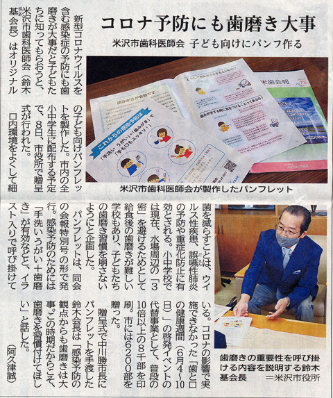 新型コロナウイルスを含む感染症の予防にも歯磨きが大事だと子どもたちに知ってもらおうと、米沢市歯科医師会(鈴木基会長・S49卒)はオリジナルのの子ども向けパンフレットを製作した。市内の全小中学生に配布する予定で、8日、市役所で贈呈式が行われた。