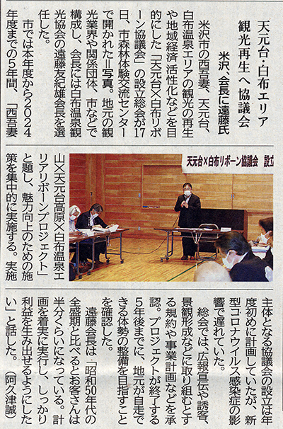 市では本年度から2024年度までの5年間、「西吾妻山×天元台高原×白布温泉エリアリボーンプロジェクト」と題し、魅力向上のための施策を集中的に実施する。実施主体となる協議会の設立は年度初めに計画していたが、新型コロナウイルス感染症の影響で遅れていた。