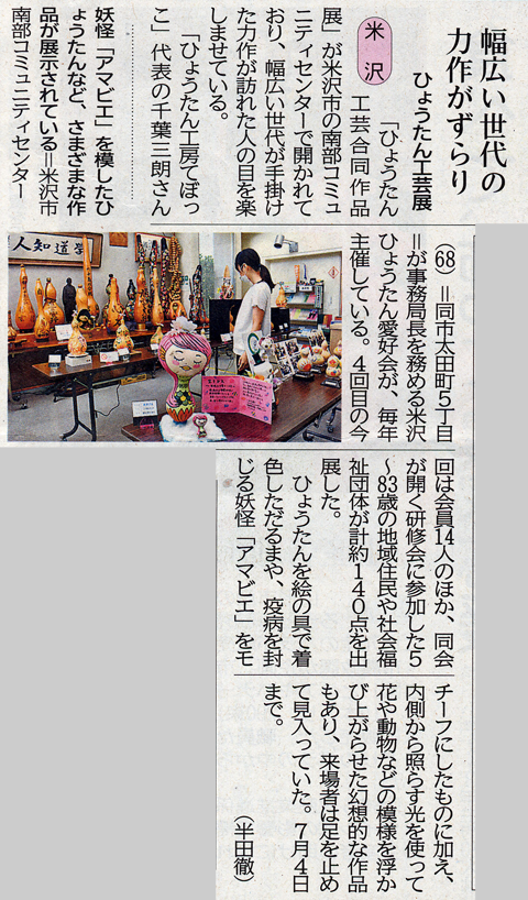 「ひょうたん工房てぼっこ」代表の千葉三朗さん(68・S45卒)=同太田町5丁目=が事務局長を務める米沢ひょうたん愛好会が、毎年主催している。4回目の今回は会員14人のほか、同会が開く研修会に参加した5〜83歳の地域住民や社会福祉団体が計140点を出展した。