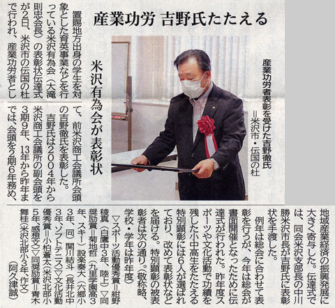 産業功労・吉野氏たたえる・米沢有為会が表彰状