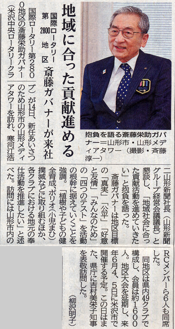 斎藤ガバナーは地区目標の「真実」「公平」「好意と友情」「みんなのため」の「四つのテスト」を活動の根幹に据えていくことを強調。「植樹や子どもの健全育成、ポリオ(小児まひ)撲滅などに取り組むほか、各クラブにおける地元の奉仕活動を推進したい」と述べた。訪問には山形市内のRCクラブメンバーら6人も同席した。