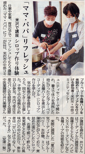 仕事や家事、育児などで疲れた「ママ・パパ」にリフレッシュしてもらう講座が21日、米沢市の中部コミュニティセンターで開かれ、暑さで体力を消耗した時にぴったりなブルーベリーと各種ハーブを煮出したコーディアル(シロップ)作りを学んだ。