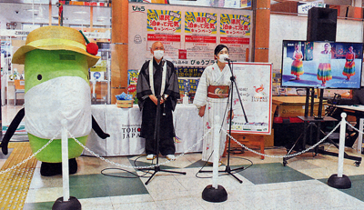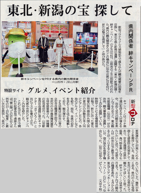 新型コロナウイルス感染拡大で落ち込んだ観光需要の回復を目指し、東北6県と新潟が連携して展開する「東北・新潟応援!絆キャンペーン」のPRが27日、山形市のJR山形駅で行われた。県内の観光関係者らが「この機会に山形や近県に目を向け、新たな魅力を発見して」と呼び掛けた。