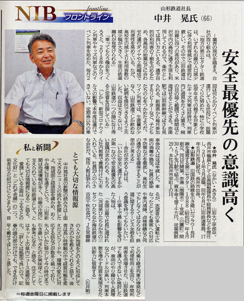 中井晃社長の新聞の読み方は1面で大きなニュースの流れを把握した上、地域面、経済面を確かめ、おくやみ欄に目を通すという。「山形新聞は地域情報が多く、沿線の住民に支えられている山形鉄道として、とても大切な情報源になる」と語る。