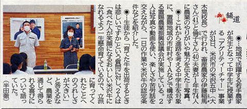 地域で活躍する若手農家が先生となって中学生に授業する「アグリティーチャー」事業が31日、米沢市の米沢五中(大木晃校長)で行われ、畜産農家の伊藤稲馬さん(41・H9卒)と倫子さん(40)夫妻が1年生74人に農業のやりがいや魅力を伝えた。