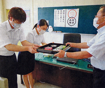 土屋教育長に「バインドBOX」を手渡す鈴木紀史さん、我妻花音さん=米沢市