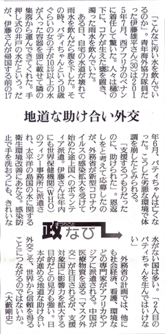 「支援するつもりだったのに、助けられた」。恩返しをと考えて応募したのが、外務省が新型コロナウイルスの感染拡大を受けて始めた途上国へのボランティア派遣。伊藤さんは年内にも世界保健機関(WHO)のフィジー事務所に派遣され、太平洋の島国の水に関する衛生環境改善にあたる。感染防止で手を洗おうにも、きれいな水がない国は多い。「2人目のバティちゃんを生んではいけない」