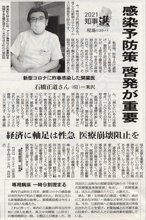 県内では昨年3月末、新型コロナの感染者が米沢市内で初めて確認された。昨年11月から新規感染者は急増し、累積感染者は今月4日に400人を超えた。