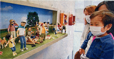 中村さんは12年前からペーパークラフトを始めた。会場には竹の水鉄砲やフラフープで遊ぶ子供たち、黒電話で楽しそうに話す娘とそれを眺める父親など、昭和の日常を切り取った作品を数多く展示。また、新型コロナウイルス早期収束の願いを込めて作った「憧れの三密」は、芝生の上で宴会をしたり、バドミントンで遊んだりしている老若男女の生き生きとした表情が印象的だ。