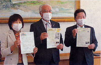 写真展などをPRする支倉常長日西文化協会・九里廣志理事長(中央・S40卒)=米沢市