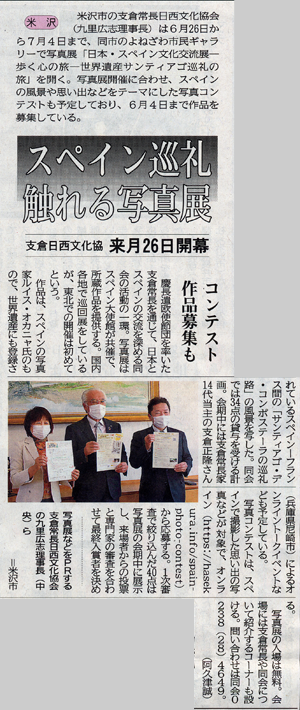 米沢市の支倉常長日西文化協会(九里広志理事長・S40卒)は6月26日から7月4日まで、同市の米沢市民ギャラリーで写真展「日本・スペイン文化交流展―歩く心の旅―世界遺産サンティアゴ巡礼の旅」を開く。写真展開催に合わせ、スペインの風景や思い出などをテーマにした写真コンテストも予定しており、6月4日まで作品を募集している。