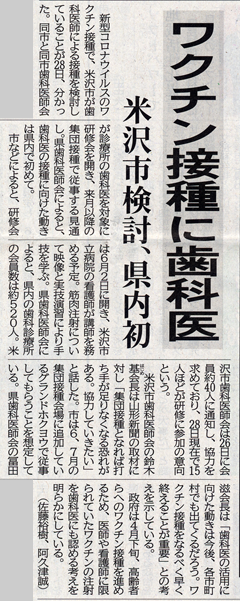 米沢市歯科医師会の鈴木基(はじめ)会長(S49卒)は山形新聞の取材に対し「集団接種となれば打ち手が足りなくなる恐れがある。協力していきたい」と話した。市は6、7月の集団接種会場に追加しているグランドホクヨウで従事してもらうことを想定している。県歯科医師会の冨田滋会長は「歯科医の活用に向けた動きは今後、各市町村でも出てくるだろう。ワクチン接種をなるべく早く終えることが重要」との考えを示している。