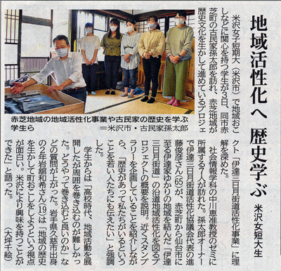 米沢女子短期大(米沢市)で地域おこしなどに関心を持つ学生が3日、同市赤芝町の古民家孫太郎を訪れ、赤芝地域が歴史文化を生かして進めているプロジェクト「伊達三日月街道活性化事業」に理解を深めた。