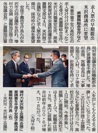 安孫子義浩支庁長らが米沢市の同会議所を訪れ増村力会頭(置賜地区商工団体協議会長・S50卒)と置賜地区雇用対策協議会の宮嶋敏郎会長(S50卒)に要請書を手渡した。増村会頭、宮嶋会長は「大事な地元の人材。コロナ後を見据え、計画性を持って求人を出してもらえるよう要請していく」などと述べた。