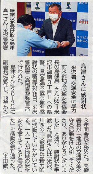 島津さんは2013年に副会長に就任し、18年から3年間会長を務めた。高橋署長が「地域の交通安全を守る活動をけん引してくださり、ありがとうございました」と述べ、感謝状を手渡した。島津さんは「米沢川西の両支部員には精力的に活動していただいている。一人一人が地域の安全安心を支えていると実感した」と活動を振り返った。