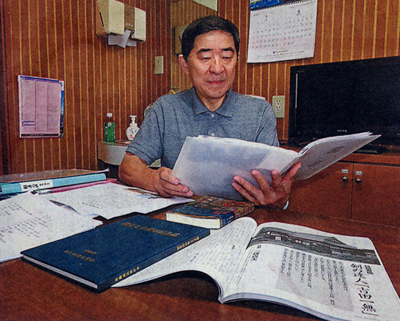 多くの史料を集めて吉田一無の研究を進めている三條貞夫さん(S45卒)=米沢市