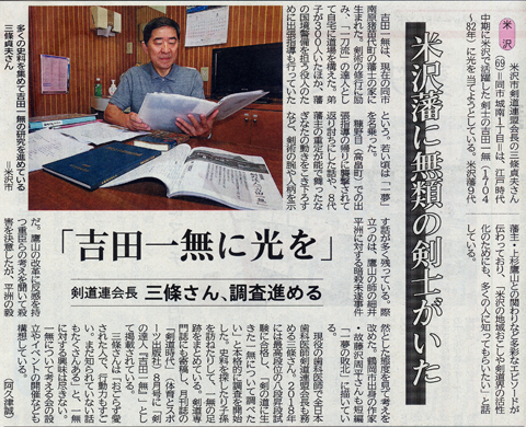 米沢藩に無類の剣士がいた・「吉田一無に光を」・剣道連会長三條さん、調査進める