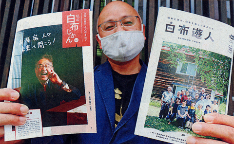 フリーペーパー「白布遊人」と安部直人さん(左写真・遠藤友紀雄さん(S58卒))