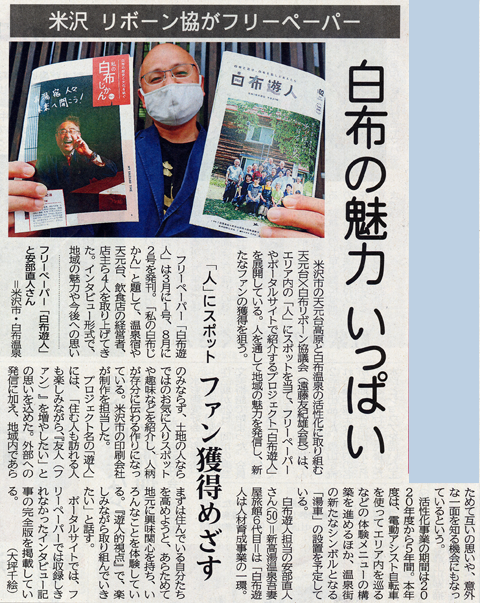 フリーペーパー「白布遊人」は3月に1号、8月に2号を発刊。「私の白布じかん」と題して、温泉宿や天元台、飲食店の経営者、店主ら4人を取り上げてきた。インタビュー形式で、地域の魅力や今後への思いのみならず、土地の人ならではのお気に入りスポットや趣味などを紹介し、人柄が存分に伝わる作りになっている。米沢市の印刷会社が制作を担当した。