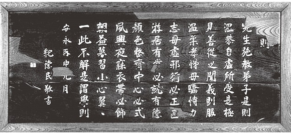 細井平洲直筆の「学則」の扁額。1917年の火災と1936年の大雪による講堂倒壊で一部破損した。